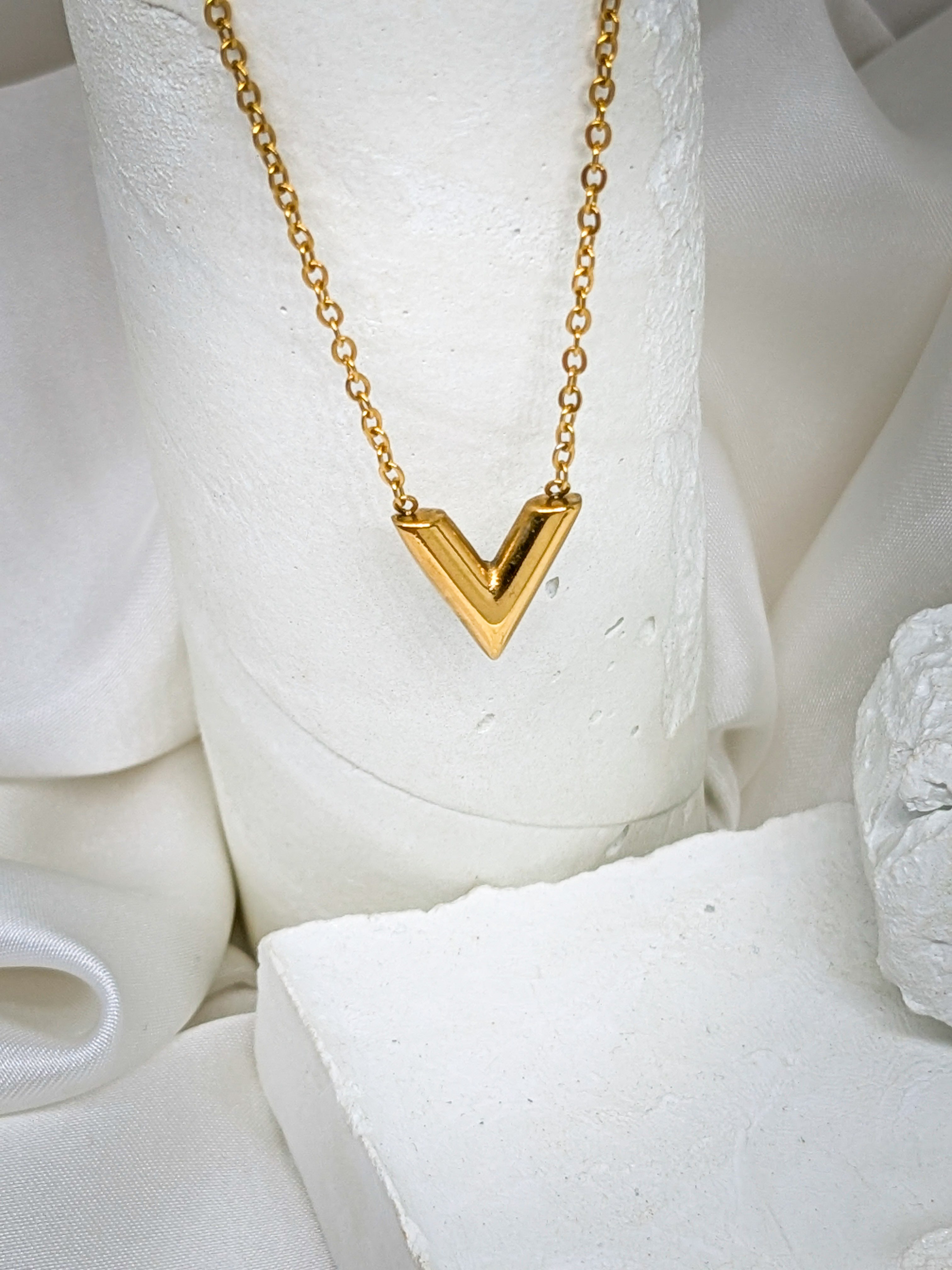 A sleek gold chain showcasing a polished, V shaped chevron pendant. Its clean lines and minimalist design create a modern, versatile piece that transitions effortlessly from casual chic to evening elegance.