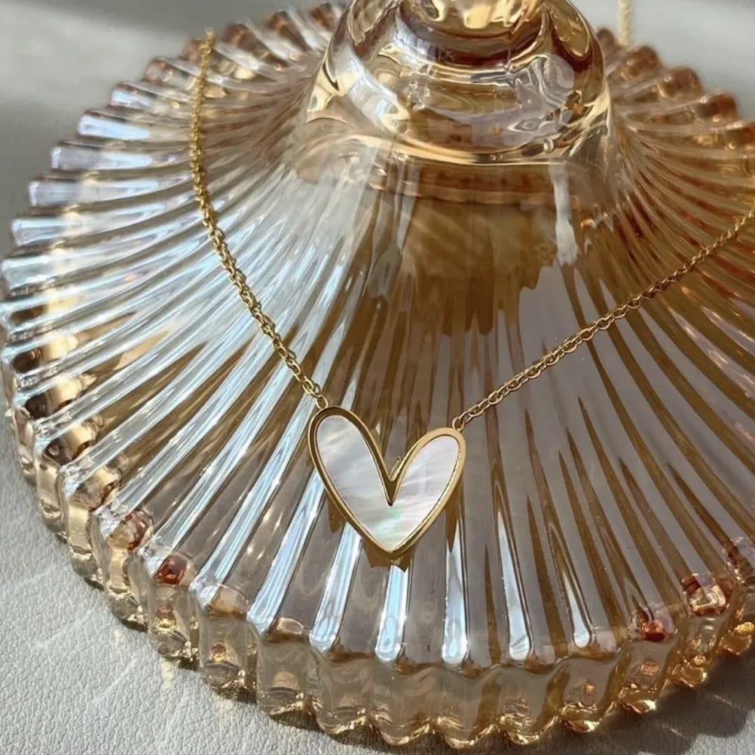 A dainty gold chain adorned with a heart-shaped pendant, crafted with a glossy mother-of-pearl inlay and golden outline, perfect for adding a soft romantic charm to any look.