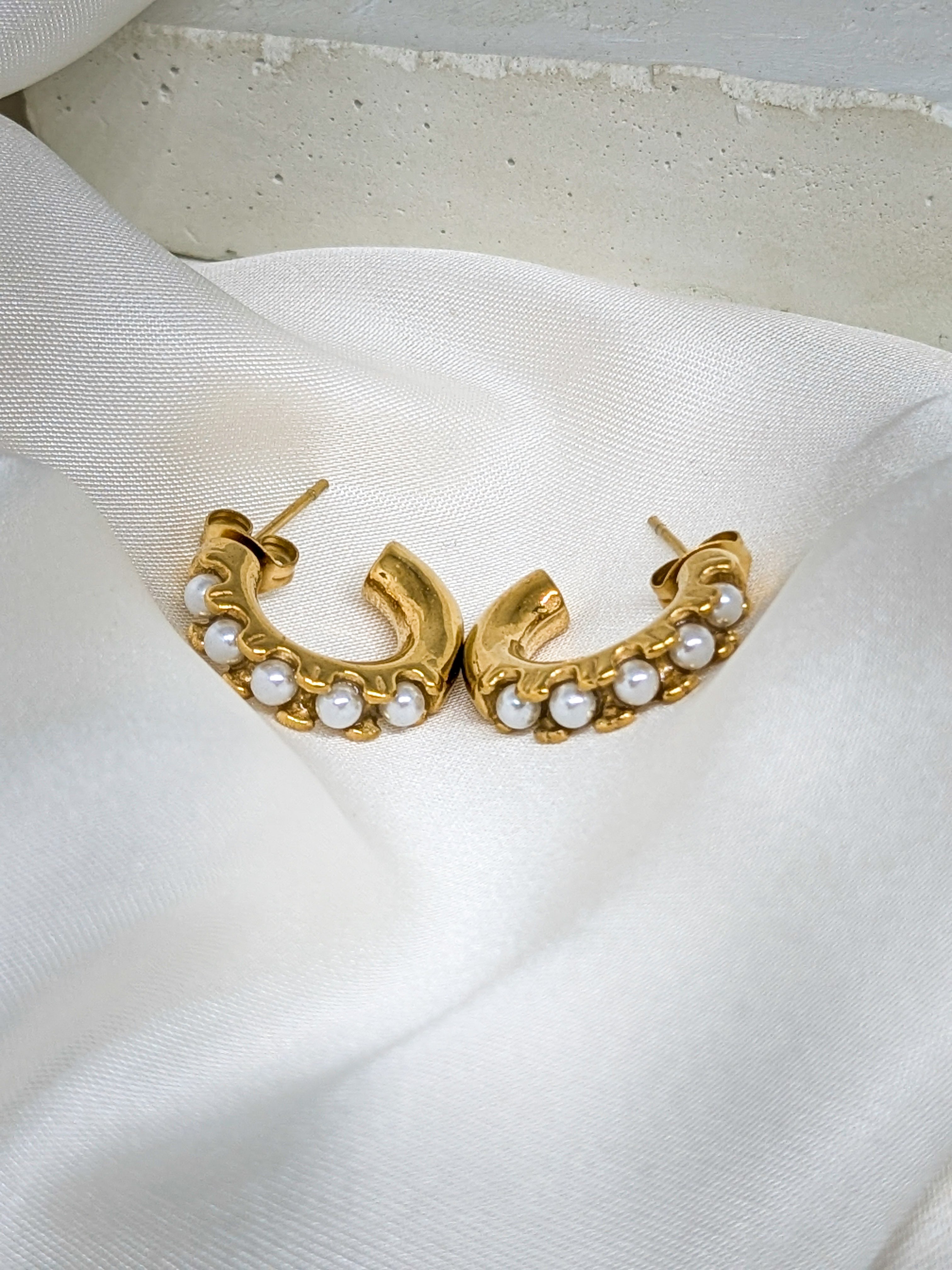 Elegant gold plated hoop earrings embellished with a row of delicate white pearls, blending classic charm with modern sophistication. Perfect for both casual and formal looks.